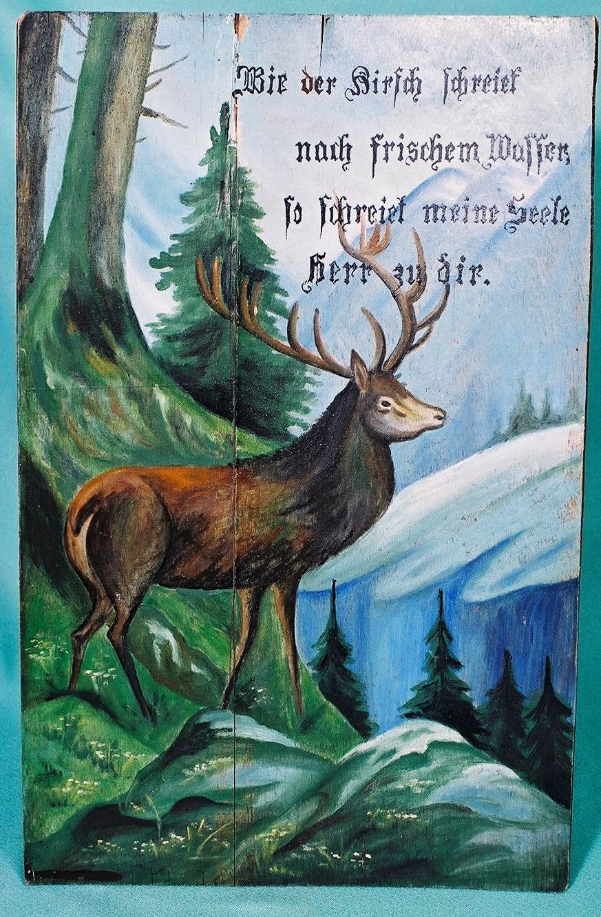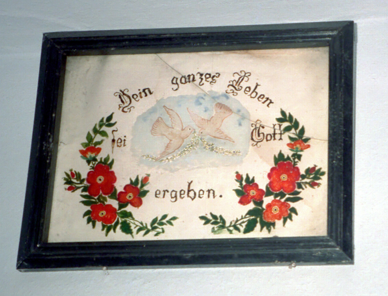 Meist wird aber bei den Russlanddeutschen ein kurzer Bibelspruch, eine Maxime erbaulicher Art als „Spruch“ bezeichnet und stellt ein kunstvoll gestaltetes und eingerahmtes Wandbild dar. In der Regel befindet sich in der Mitte des Bildes ein Zitat aus dem Evangelium oder dem Alten Testament, das an den Rändern mit floralen Ornamenten verziert ist. Manchmal stehen christliche Symbole oder Attribute (Kreuz, Buch) im Mittelpunkt, und die floralen Muster werden durch eine Landschaftskomposition ersetzt. Die Tradition, Zitate aus religiösen Büchern (Sprüche) in Form von Gemälden zu gestalten, ist zwar bei den Russlanddeutschen weit verbreitet, ist aber vor allem für protestantische Bräuche charakteristisch und war besonders bei den Mennoniten und später bei den Baptisten zu finden.